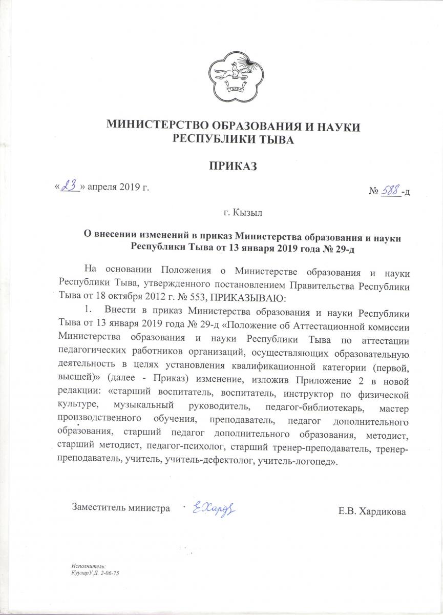 Приказ министерства образования и науки Республики Тыва от 23 апреля 2019 года №588-д «О внесении изменений в приказ Министерства образования и науки Республики Тыва от 13 января 2019 года №29-д