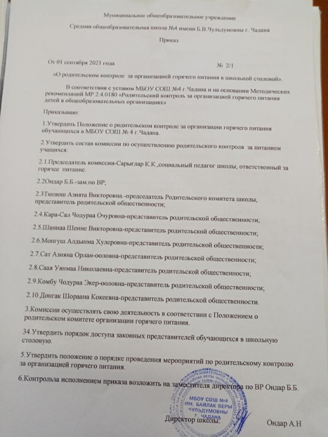 Приказ о родительском контроле за организацией горячего питания в школе